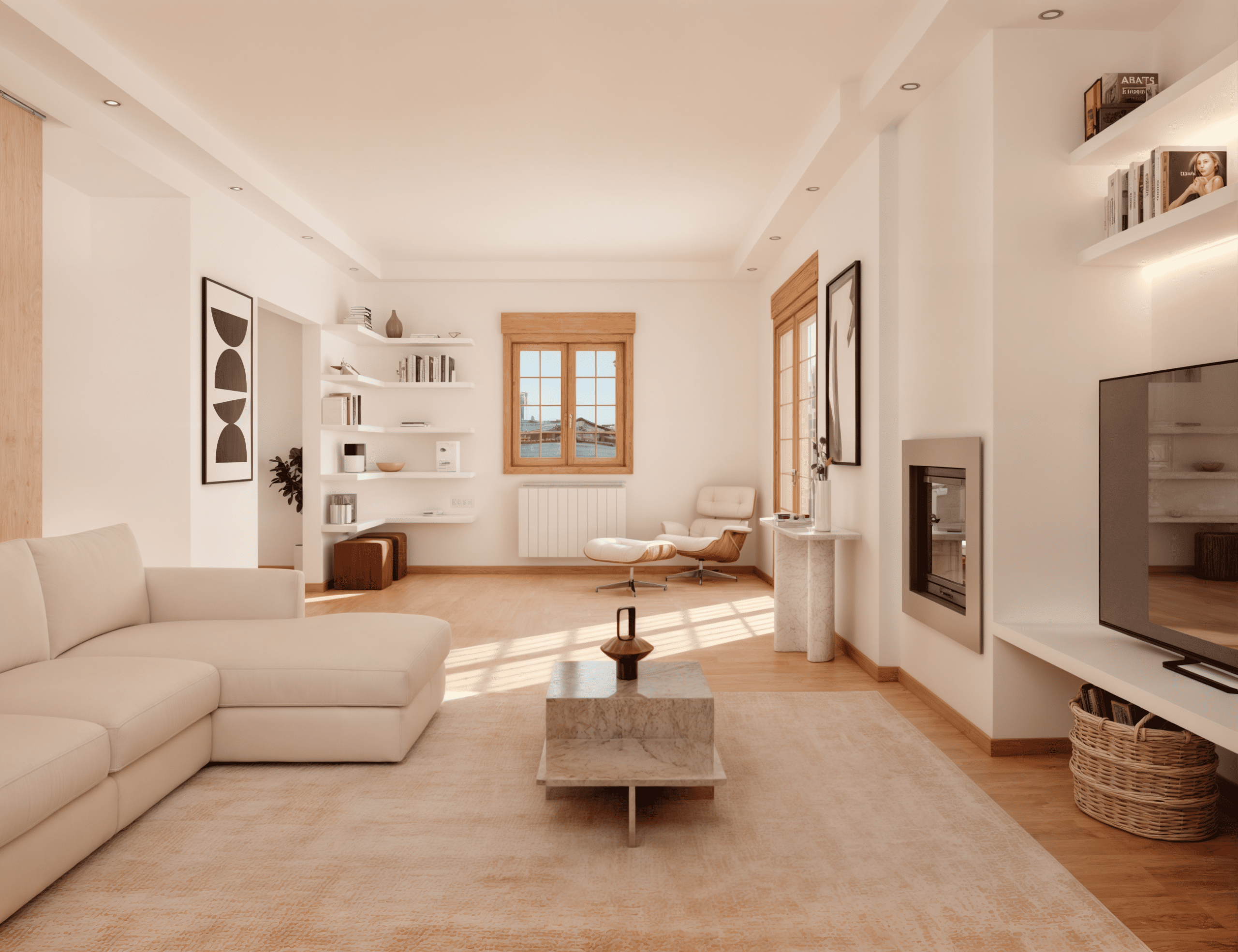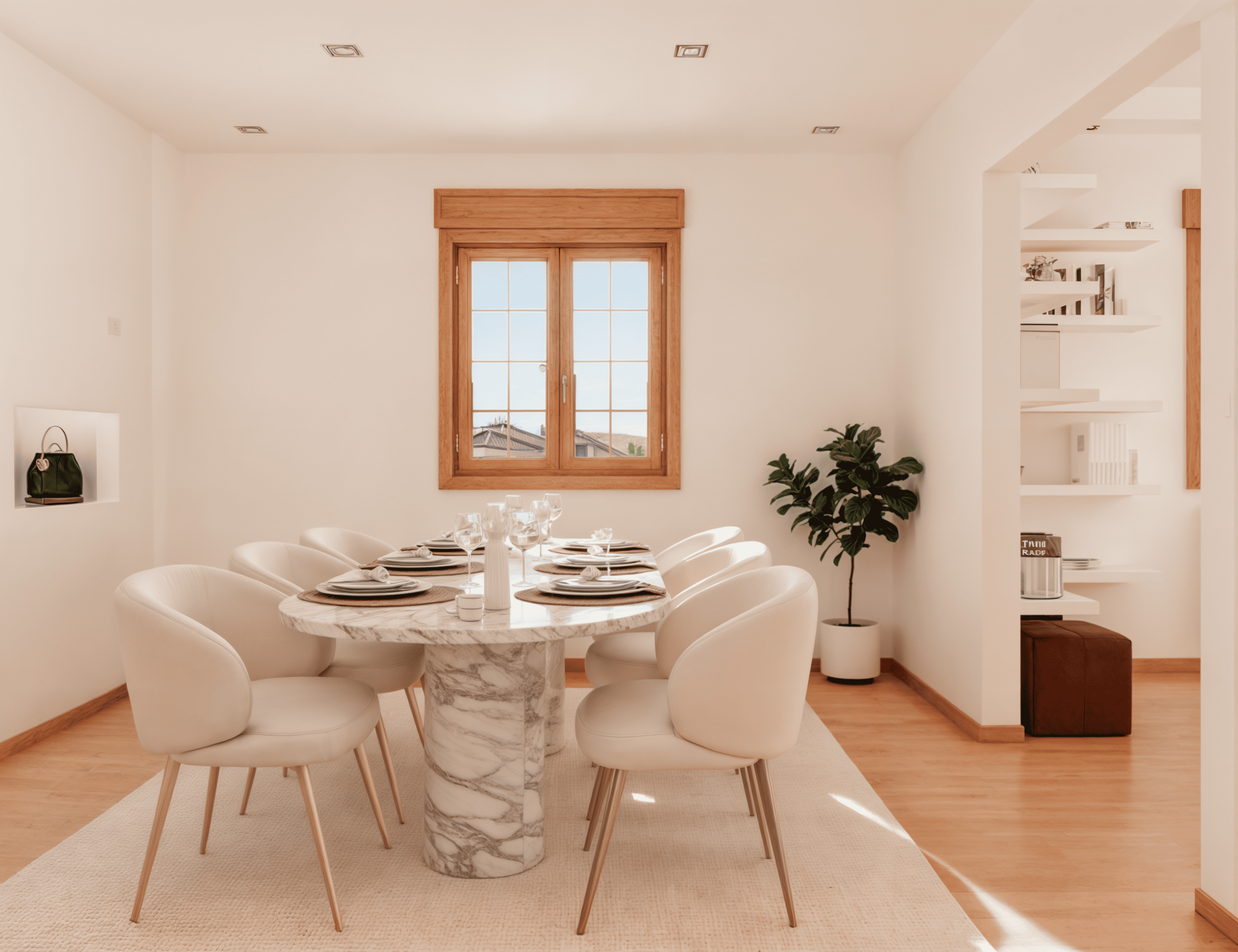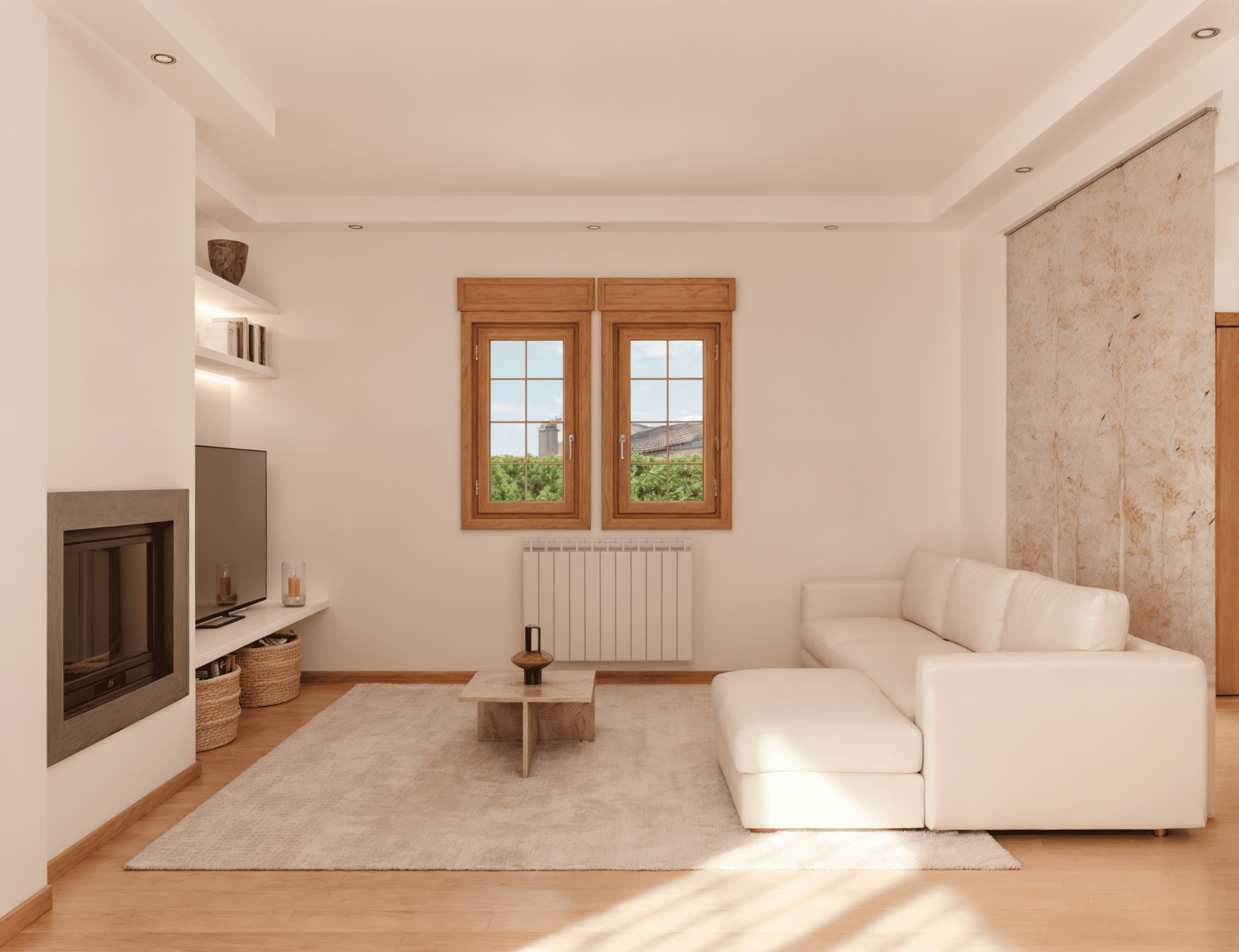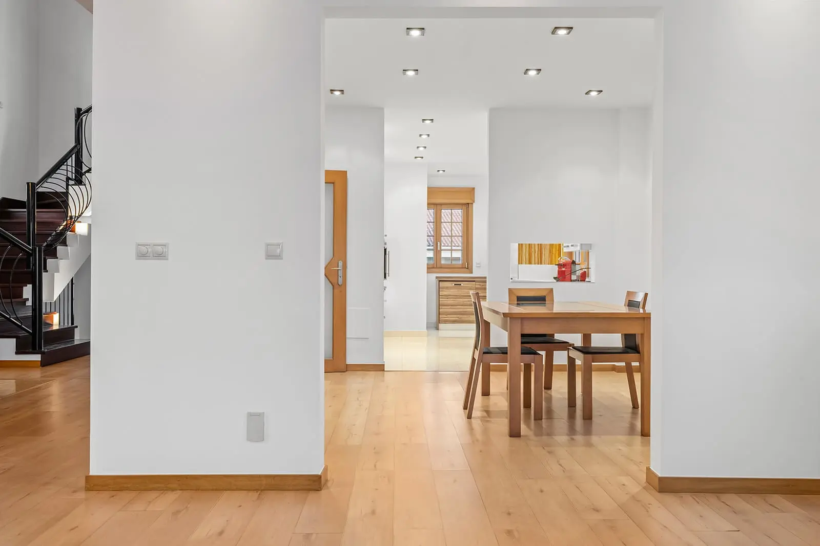 O hall de entrada, com pé-direito duplo, cria uma sensação de luminosidade e amplitude. A sala de estar, virada a sul e equipada com recuperador de calor, proporciona um ambiente acolhedor e convidativo, enquanto a sala de jantar, tem acesso direto à cozinha totalmente equipada, garantindo praticidade no dia a dia.